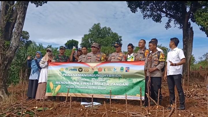 BOGOR, iNewsBogor.id - Dalam rangka mendukung program ketahanan pangan nasional, Kepolisian Sektor (Polsek) Citeureup, Kabupaten Bogor, melaksanakan kegiatan penanaman jagung hibrida di lahan pertanian seluas 5.000 meter di Desa Hambalang, Kecamatan Citeureup.